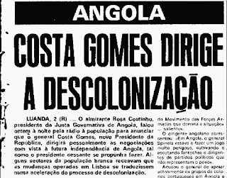 A 2 de Outubro de 1974, ao Quitexe e embrulhadas em jornal, chegaram notícias frescas de Luanda: Rosa Coutinho, presidente da Junta Governativa de Angola, falara na véspera (hoje se fazem 39 anos) à população angolana, através da rádio, e dera conta que o general Costa Gomes, Presidente da República, iria dirigir pessoalmente as negociações que levassem à independência de Angola. Já António Spínola dissera o mesmo, mas abdicara da presidência, semanas antes.para sair para mais uma operação, ou escolta, ou patrulhamento