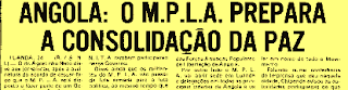 | Há 44 anos, o MPLA assinou o cessar-fogo e, segundo o Diário de Lisboa de 24/10/1974, preparava «a consolidação da paz» em Angola |